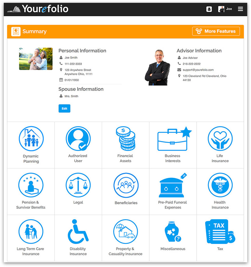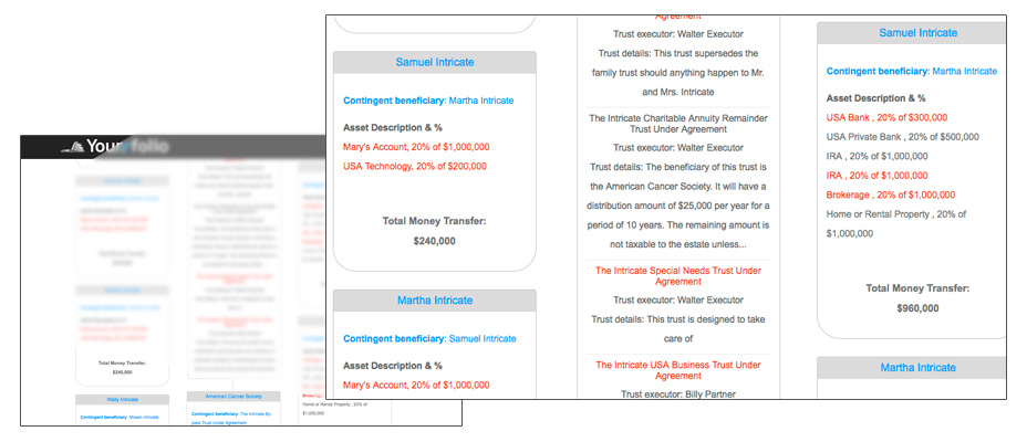 After everything is gathered and entered into the Yourefolio system, with the click of a button, bring it all together in this simple to understand Plan Design Summary. No matter how simple or complex an estate can be, our Plan Design Summary is guaranteed to be understood by your clients and their beneficiaries